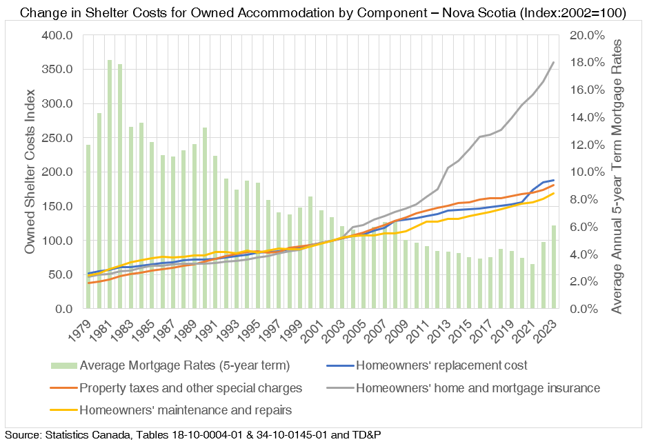 Among these components, the one that stands out the most is the cost for homeowners’ home and mortgage insurance, which has grown 21.2%, more than any other component since 2020 (property taxes and other special charges grew 8.1%, and home maintenance and repair costs grew 9.9% over the same period). We have seen home prices grow at record levels in Nova Scotia, and in Canada more generally. When the home prices increase, it means it would cost more to replace those homes, so the insurance price for those homes increase as well. The other half of this, mortgage insurance costs, is the cost of insuring your loan in case you default. It is available to homebuyers, through the Canda Mortgage and Housing Corporation, giving prospective home buyers the chance to put down less than 20% of the purchase price. It is an insurance to the lender in case the borrower defaults. It isn’t available if the home price is a million or more. If it’s any consolation, this dramatic growth didn’t just start after the pandemic. The first large increase in home and mortgage insurance costs in our province came in 2004 (+13.9%), then another in 2013 (+18.2%), and then the latest in 2023(+8.4%).