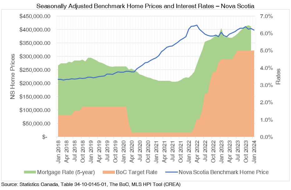 So, we see that despite inflation creeping into the BoC target threshold, shelter costs remain on the rise. But can we expect these to come back down? Well, one of the biggest things that this depends upon is the price for homes. If the price for homes were lower, home and mortgage insurance amounts would be lower too. There are signs that suggest that the periods for large home price increases are behind us for now. The benchmark home price in Nova Scotia in January 2024 was 1% lower than two years ago. In fact, since it peaked in April 2022, the benchmark has fallen 4.5%.