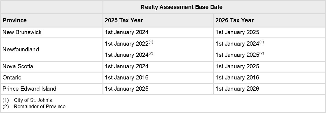 The various provincial Assessment Acts decree that your property tax assessment be based on the Market Value of your property on a specified “base date”. The Market Value is the price you would realize if you sold the property on the open market. If your property is located in Ontario, New Brunswick, Prince Edward Island, Nova Scotia or Newfoundland, the relevant base dates are as follows: