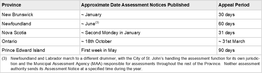 Assessment Authorities such as MPAC (Ontario), Service New Brunswick, Taxation PEI, PVSC (Nova Scotia), MAA (Newfoundland) usually assess properties below their Market Value to discourage appeals and make life easier for themselves. Unfortunately there is nothing uniform about the degree of under-assessment so nearly identical properties can have very different property tax assessments. Fortunately most Assessment Acts anticipate this type of trick and mandate some type of “uniform” property assessment provision legislating that like properties bear similar property assessments. So it is very usual for a property to be assessed at less than its Market Value but still be over-assessed and thus a good candidate for a successful assessment appeal. The Assessment Appeal Periods are often short: